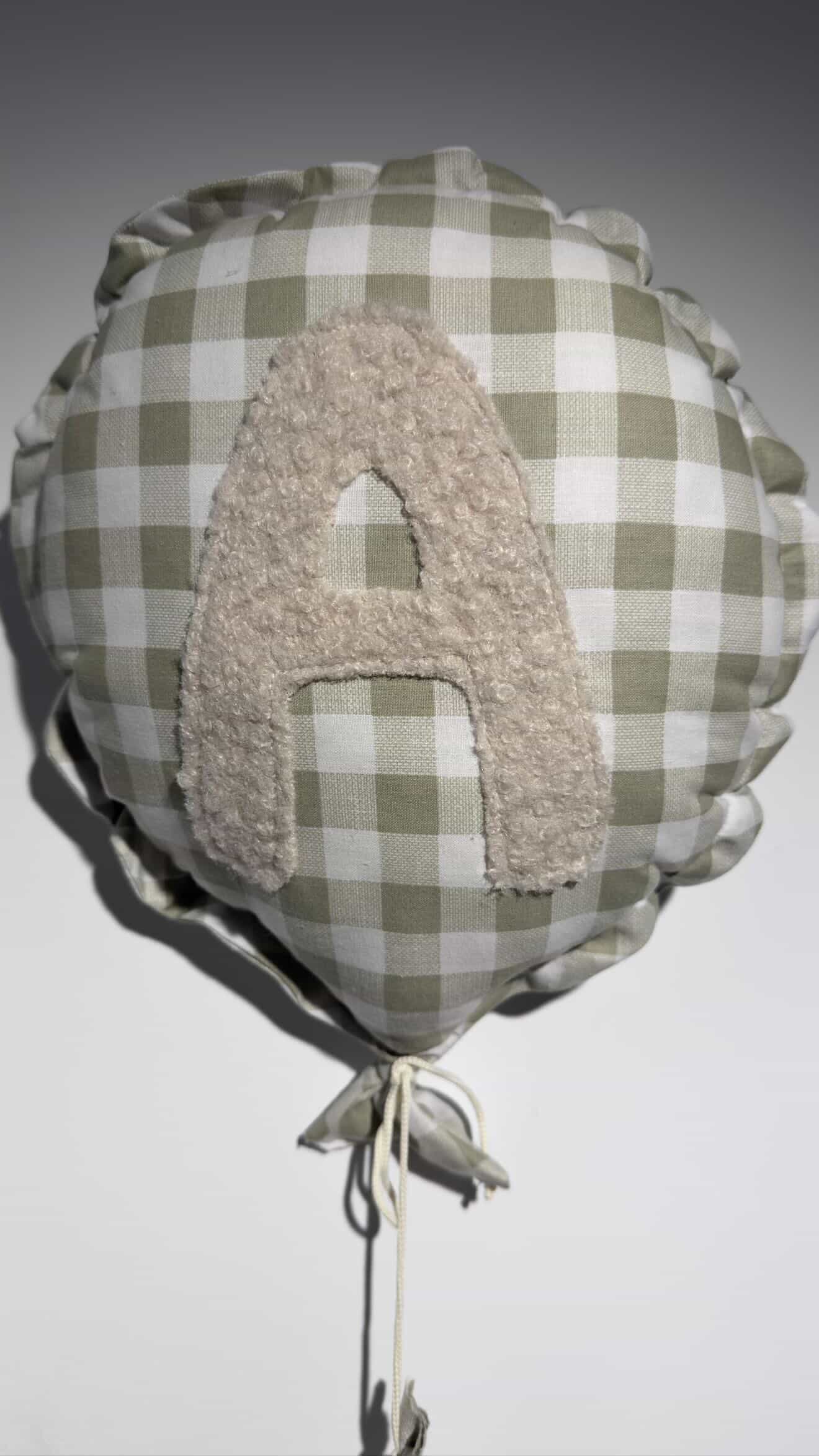 Διακοσμητικό μαξιλάρι μπαλόνι με το γράμμα "Α". Ένα γλυκό υφασμάτινο μπαλόνι, ιδανικό για να δώσει προσωπικότητα και θαλπωρή στο παιδικό δωμάτιο. Κατασκευασμένο από απαλό βαμβακερό ύφασμα σε καρό μοτίβο. Διαθέτει κορδόνι για εύκολη ανάρτηση και μικρές υφασμάτινες λεπτομέρειες που ολοκληρώνουν το look. Ιδανικό για μονόγραμμα ονόματος, δώρο γέννησης ή βάπτισης και για όσους αγαπούν τις minimal αλλά ζεστές παιδικές διακοσμήσεις.
