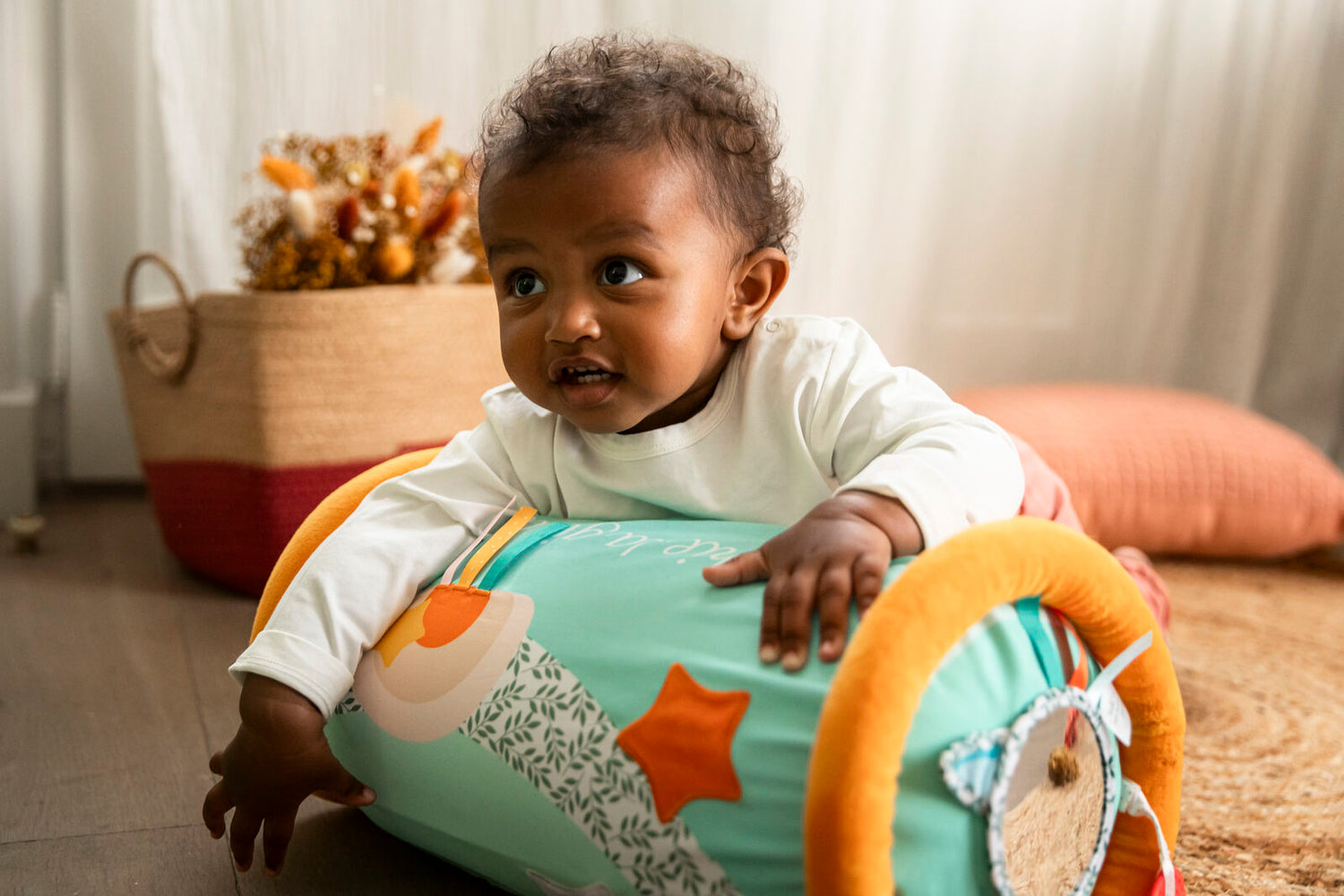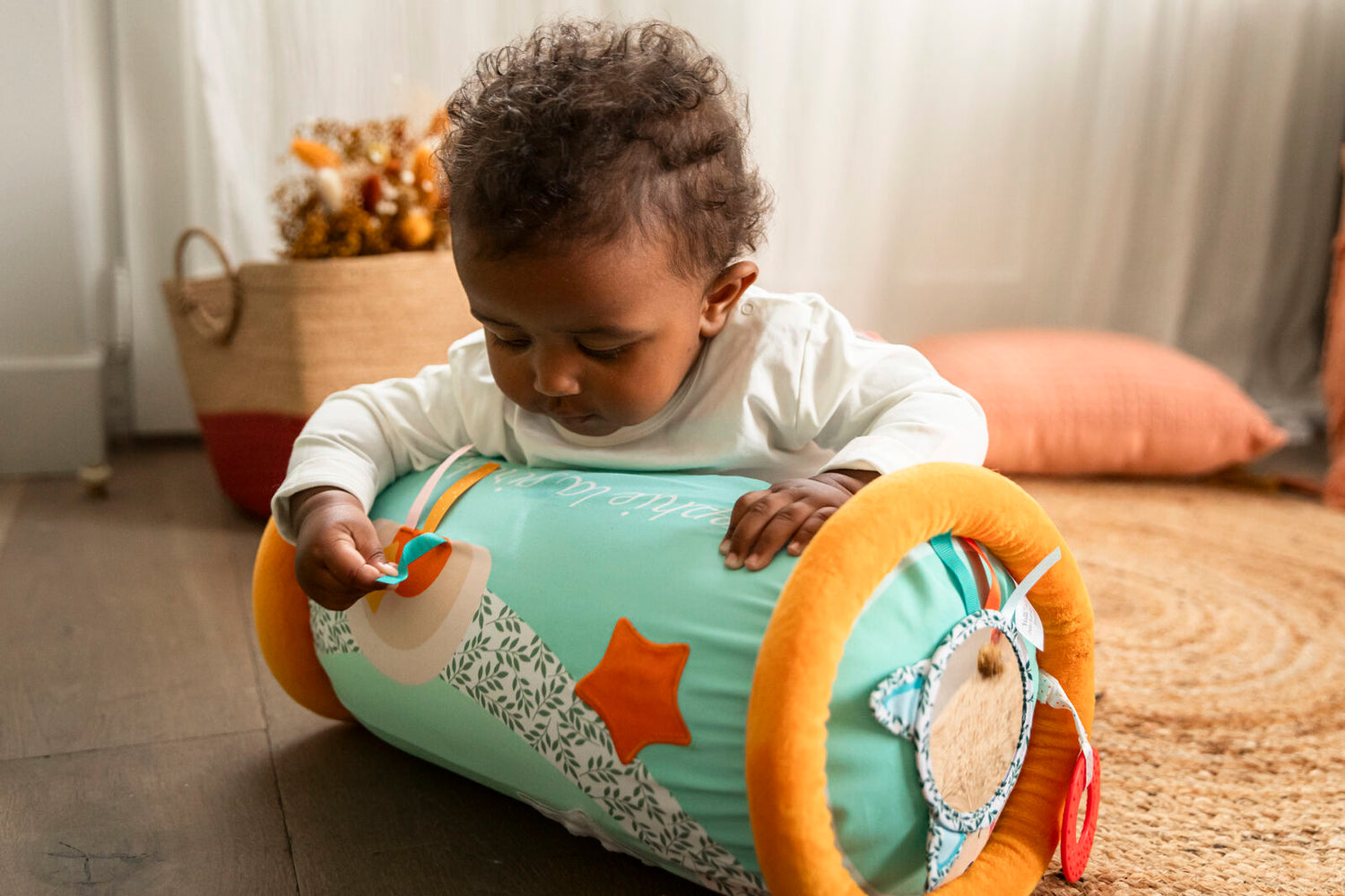 Η πάνινη επένδυσή του που αφαιρείται και πλένεται, έχει σχέδια, καθρέφτη, μπάλες με υφή και επιφάνειες με ήχους.