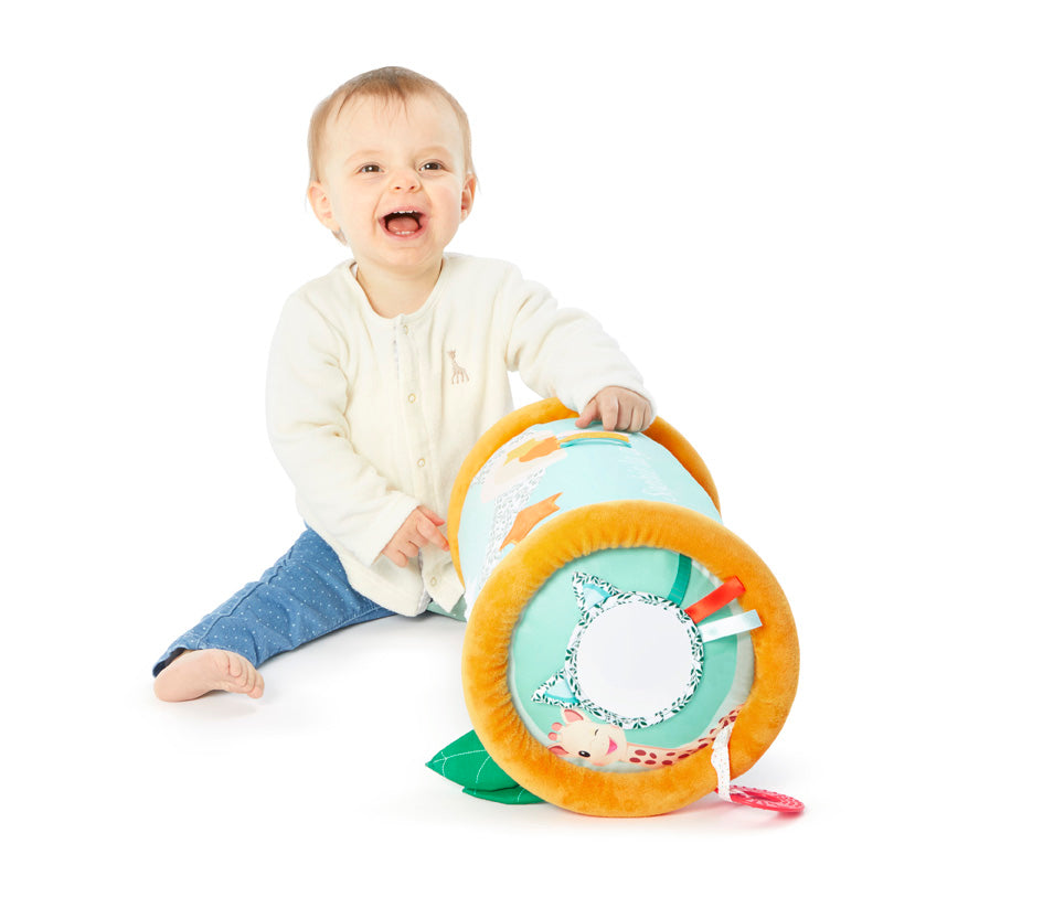 Ελαφρύ και πάνινο βαρελάκι από τη σειρά Σόφι η καμηλοπάρδαλη, με εναλλασσόμενες δραστηριότητες σε όλη την επιφάνεια, για μωρά από 6 μηνών.